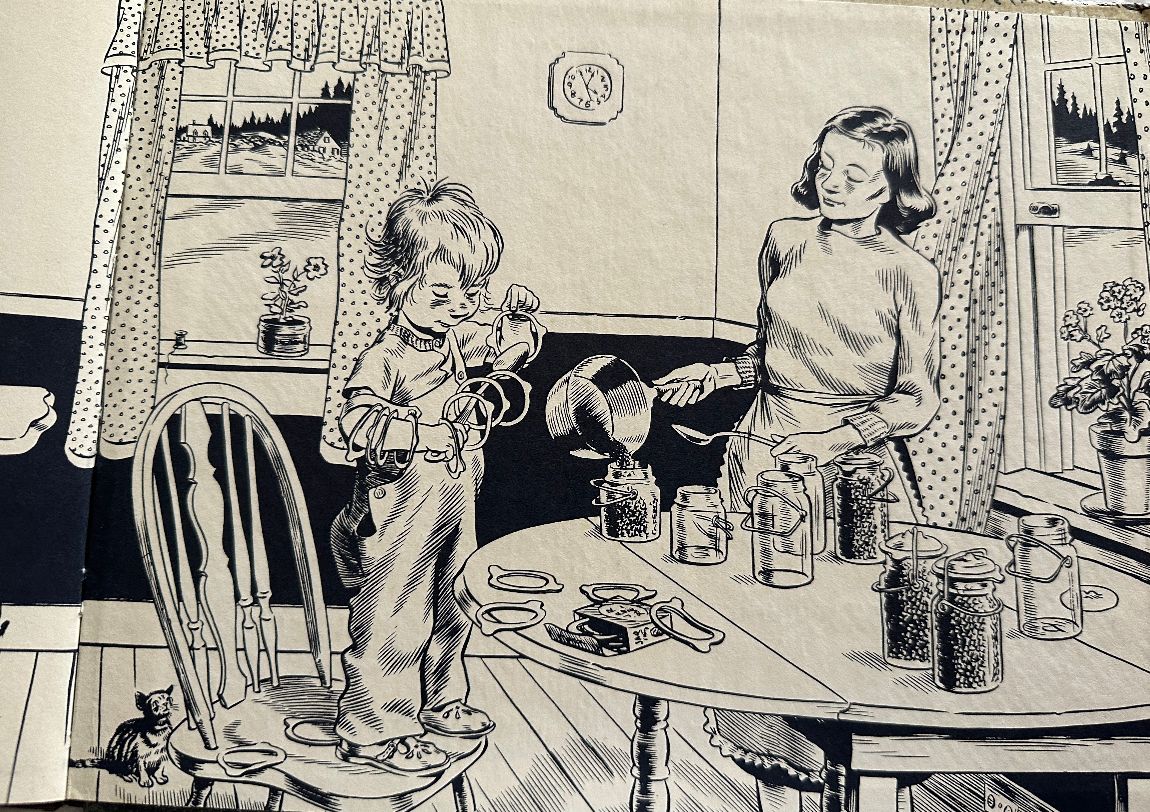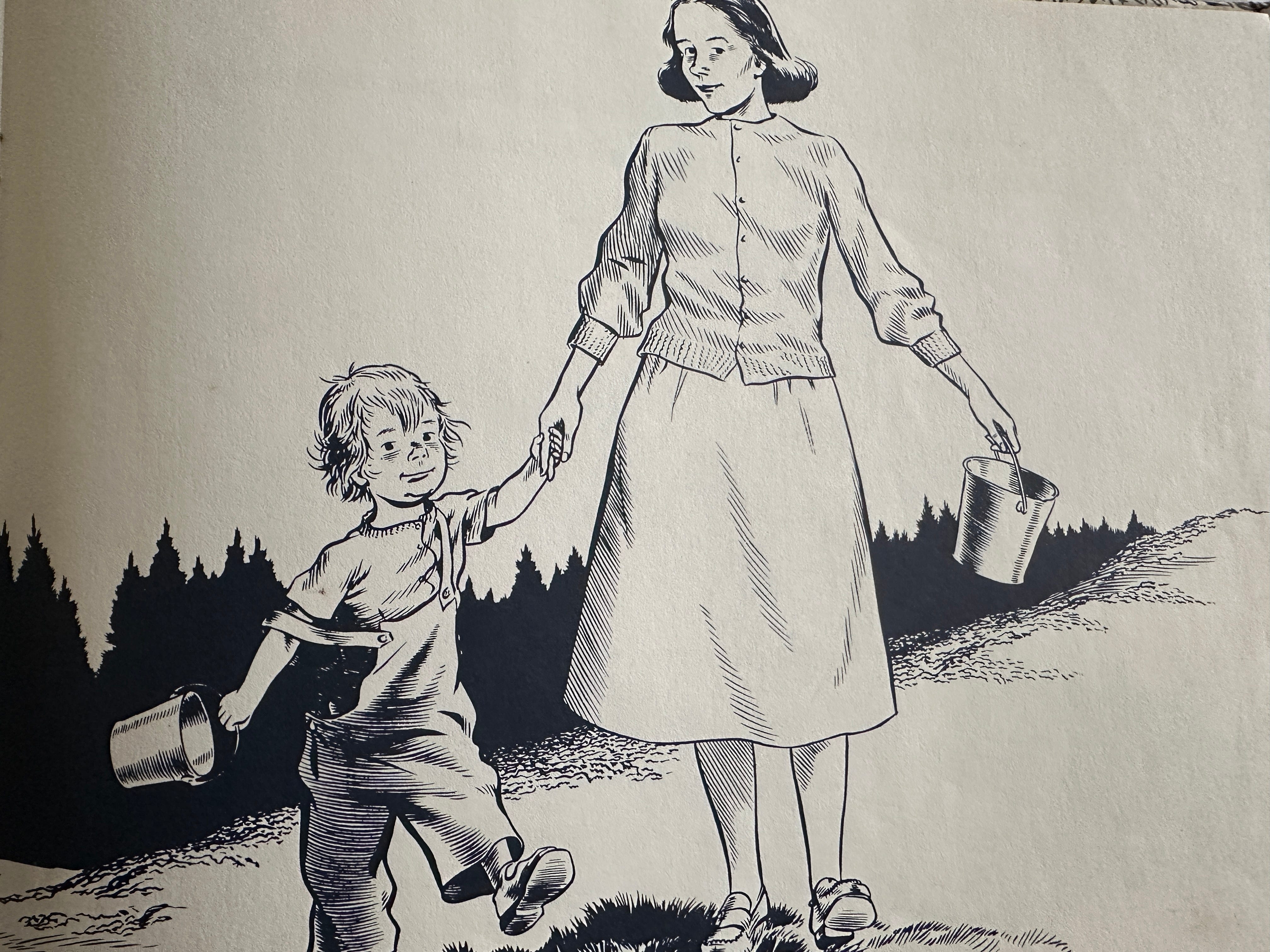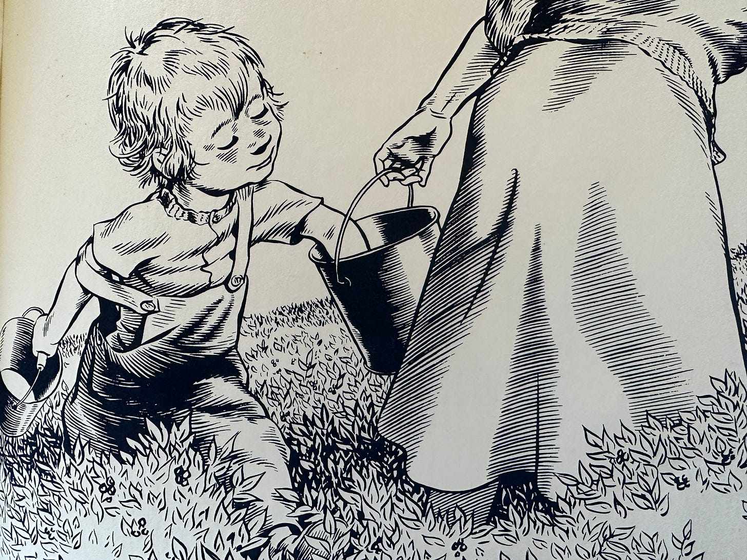 A 1948 review in Library Journal describes McCloskey’s artwork “as true to the life line of the Maine coast as to the living child and her mother in their search for blueberries on their island.”