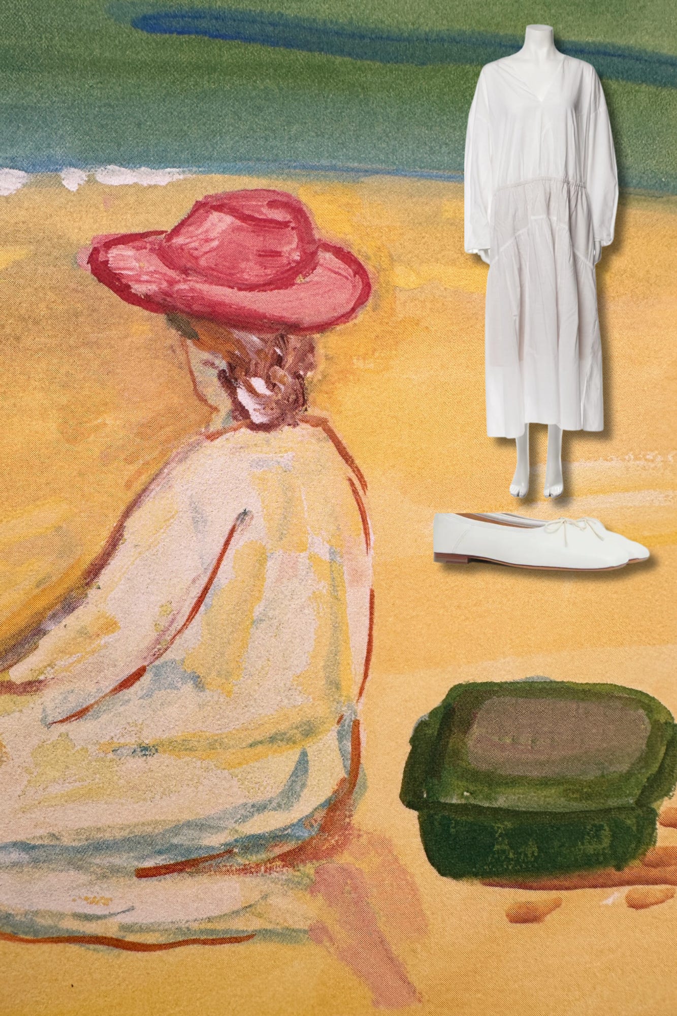 LOEWE Bucket Bag, Beach Umbrella, Lorna Murray Hat, Beach Blanket, Kinto water bottle, ADINA REYTER Earrings, Desert Vintage Dress