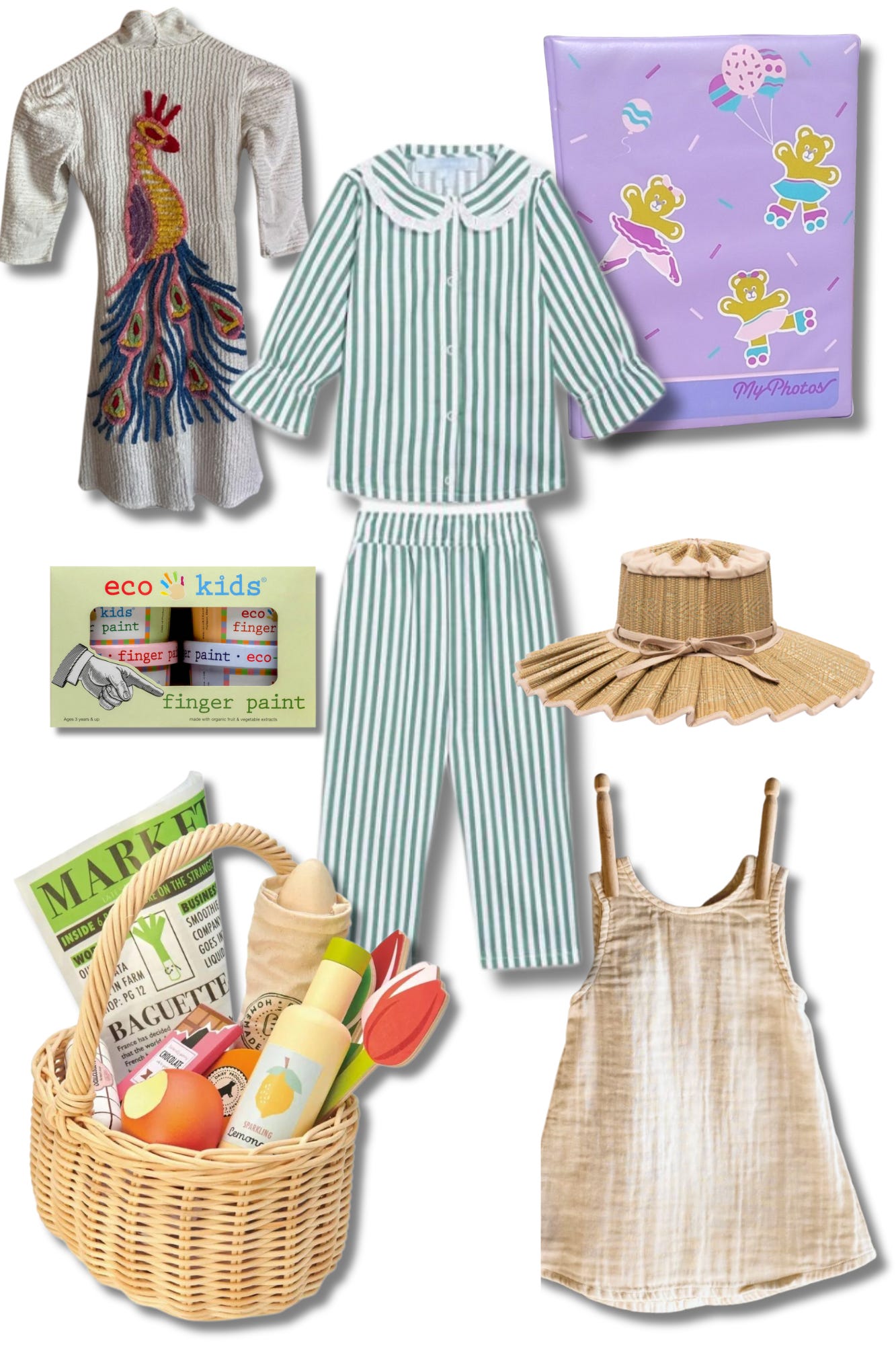 Vintage Bathrobe, Hill House Home PJs, 90s Photo Album, EcoKids Finger Paint, LORNA MURRAY Hat, Tender Leaf Toys Farmer's Market Basket, N. 74 Dress